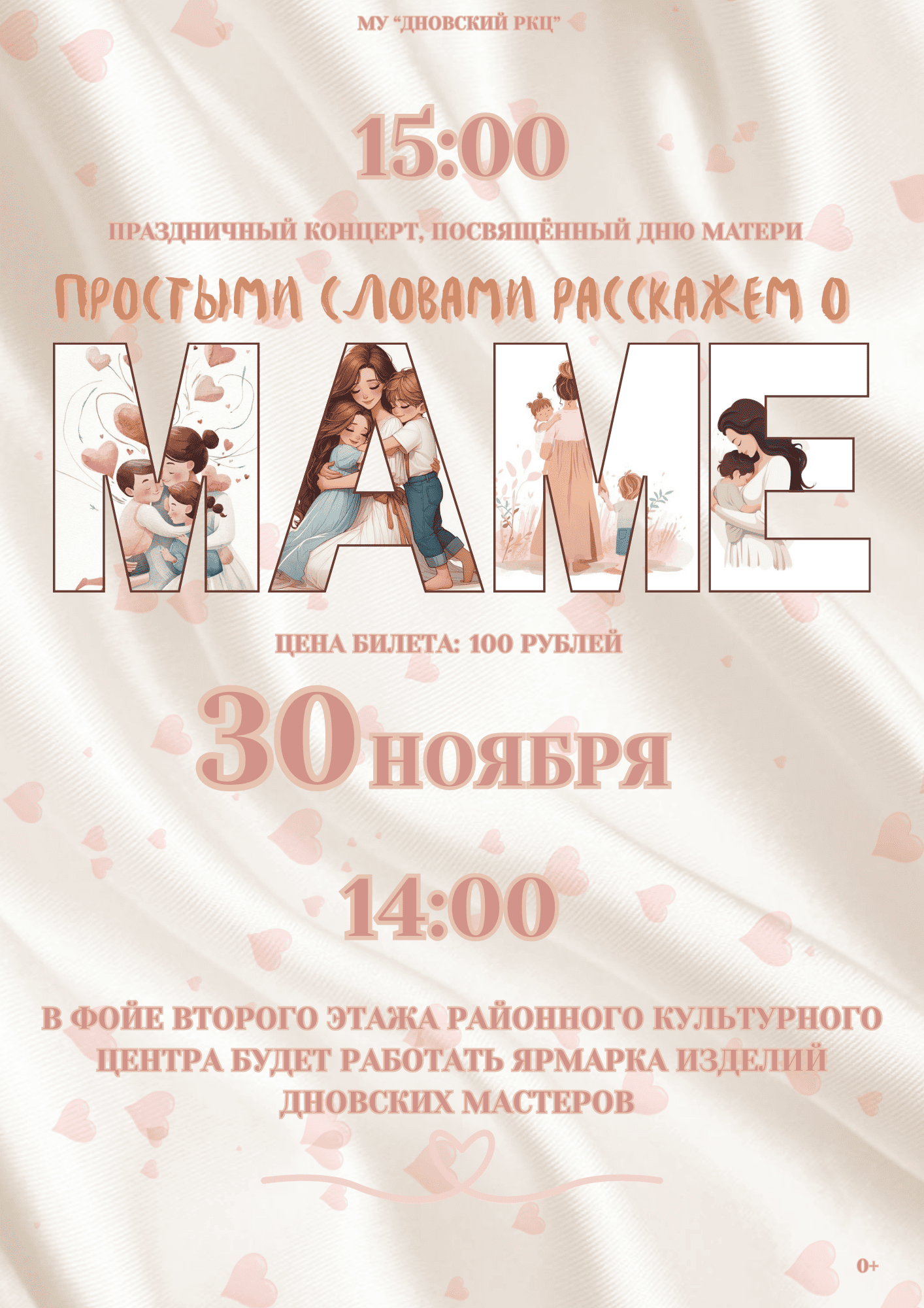 Вас ждёт концерт «Простыми словами расскажем о маме» — трогательные песни, стихи и творческие номера, которые отразят всю глубину чувств к нашим мамам. Каждое выступление — это искренний рассказ о любви, благодарности и бесконечной нежности.
